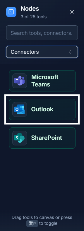 Add the Node: First, drag the SharePoint connector from the Connectors panel onto your canvas.