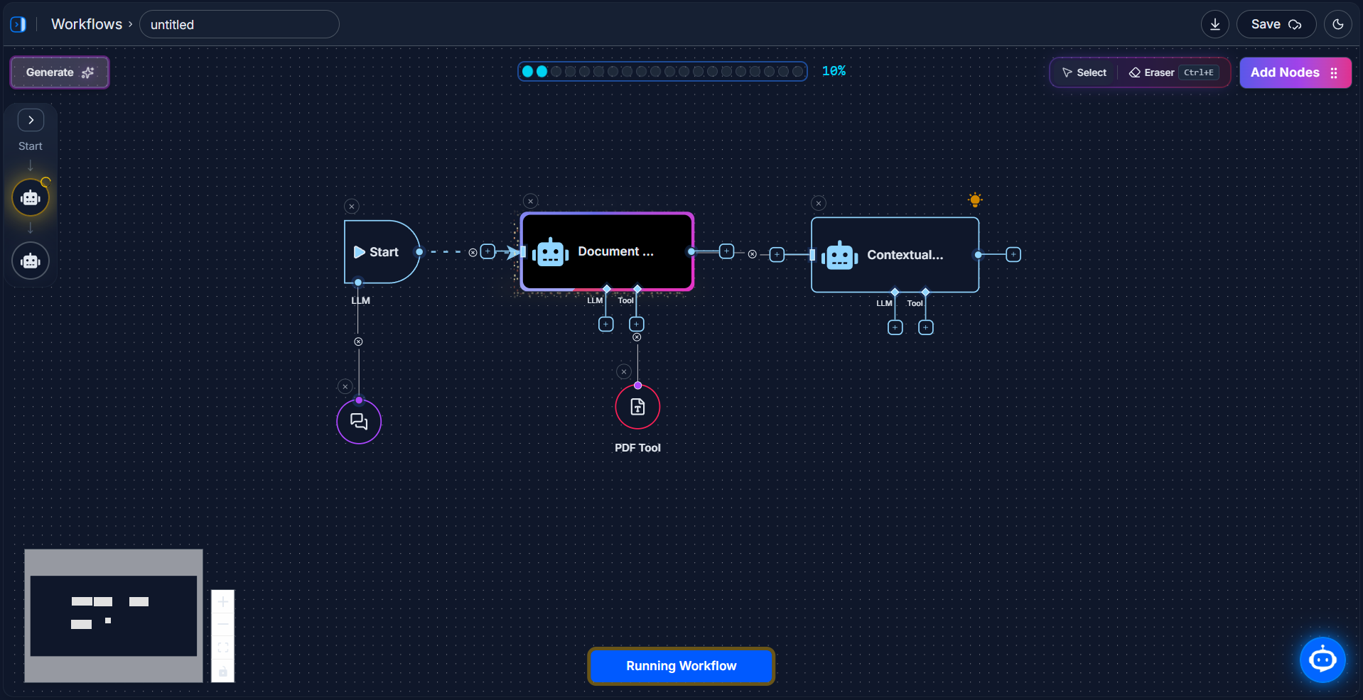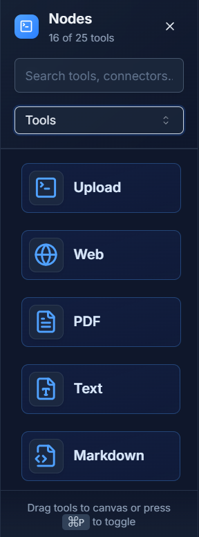 Tools are nodes that perform specific jobs inside your workflow. The PDF Tool lets your workflow read PDF files, and the Web Tool lets it browse websites.