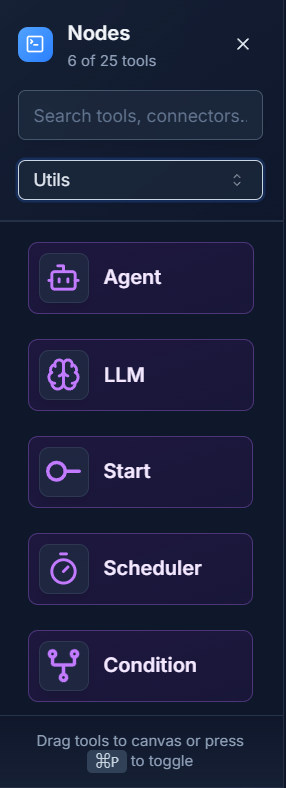 Utils (short for Utilities) are special nodes that manage your workflow. The Start util begins the process, and a Condition util creates a fork in the road, sending data down different paths based on rules you set.