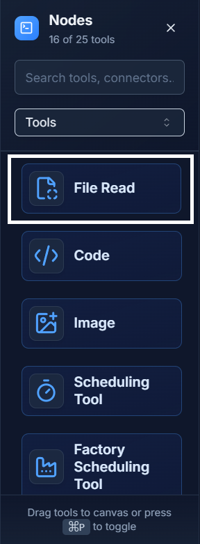Add the Tool: Drag the File Read Tool from the Tools panel onto your canvas.