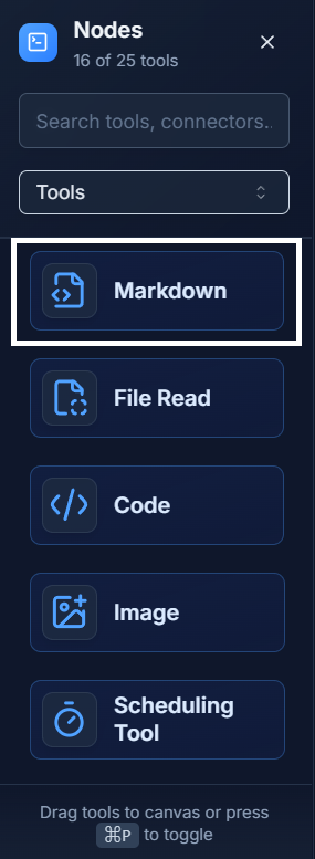 Add the Tool: Drag the Markdown Tool from the Tools panel onto your canvas.