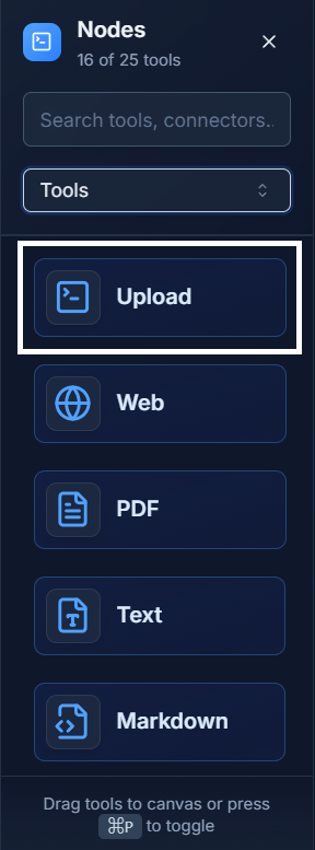 The Upload Tool acts as a placeholder for a file. When you run a workflow containing this tool, the execution will pause, and a pop-up window will appear, prompting you to upload a file from your computer. Once you upload the file, the workflow resumes, and the file's data is passed to the next node.