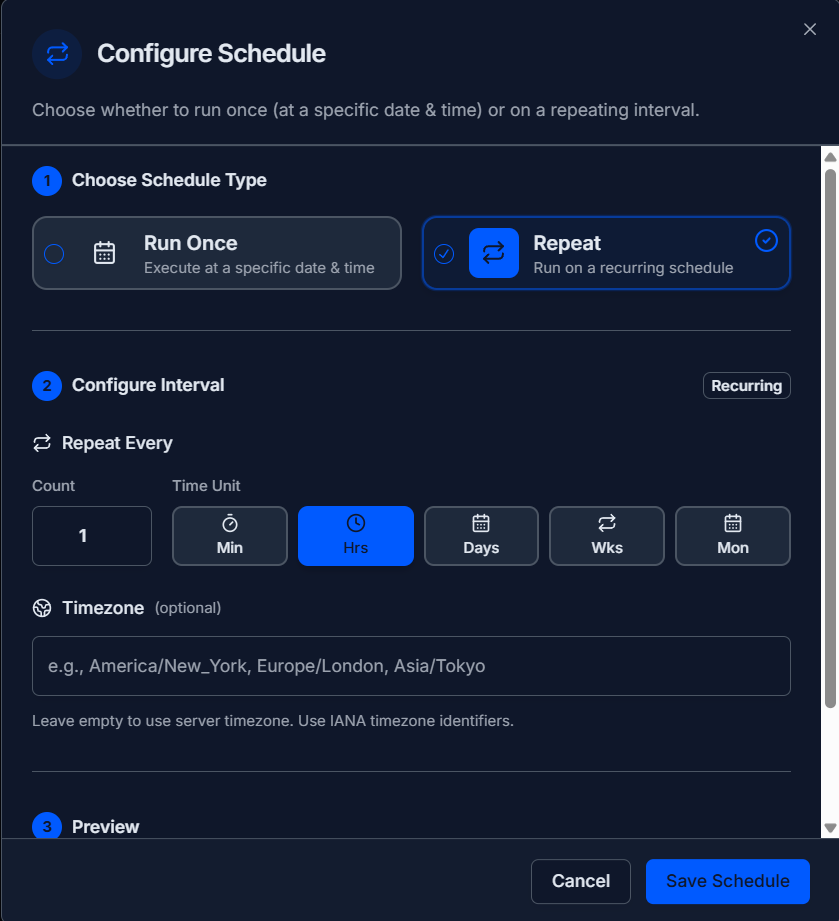 Choose Schedule Type: Select whether you want the workflow to run once or on a repeat schedule.