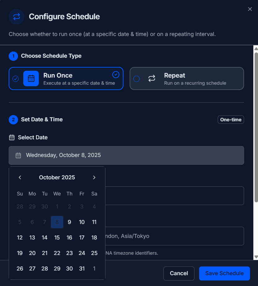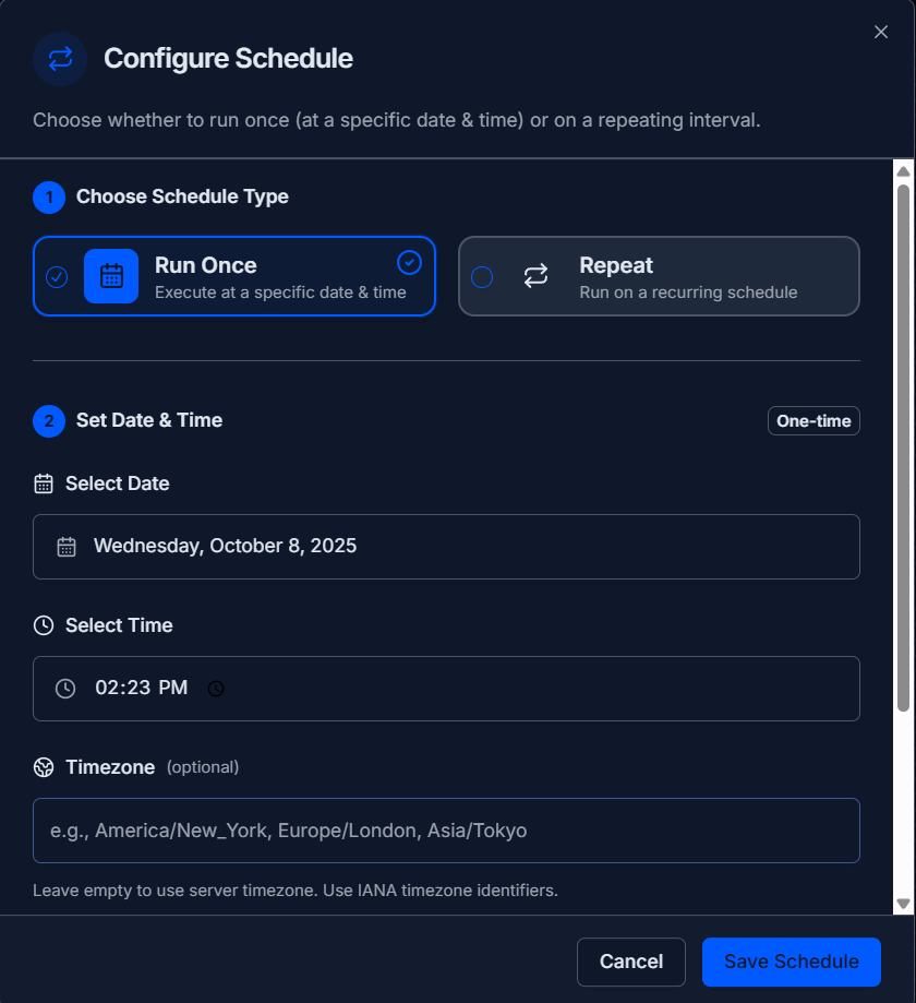 Set Date & Time (for Run Once): If you choose "Run Once," you will specify the exact date and time for the execution.